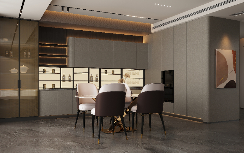 餐酒柜與餐邊柜,有效緩解廚房、餐廳、客廳的空間儲(chǔ)物壓力,搭配同色系餐桌椅,更有空間秩序感,氛圍更整體統(tǒng)一。