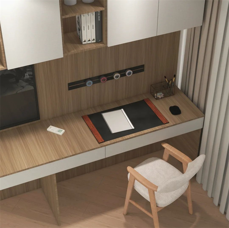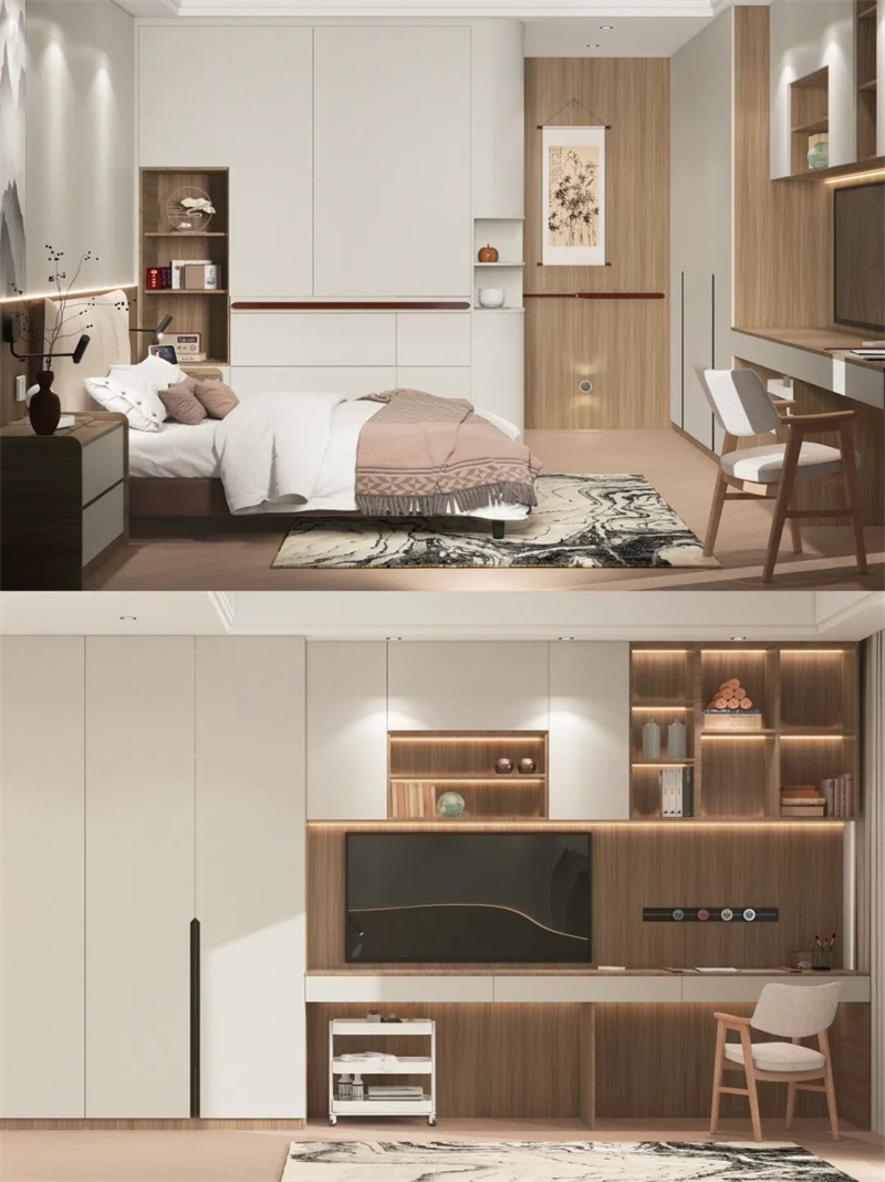 ??床尾選擇做衣柜+書桌柜一體化設(shè)計(jì),看書、練書法、看電視,在家悠閑樂(lè)享時(shí)光?