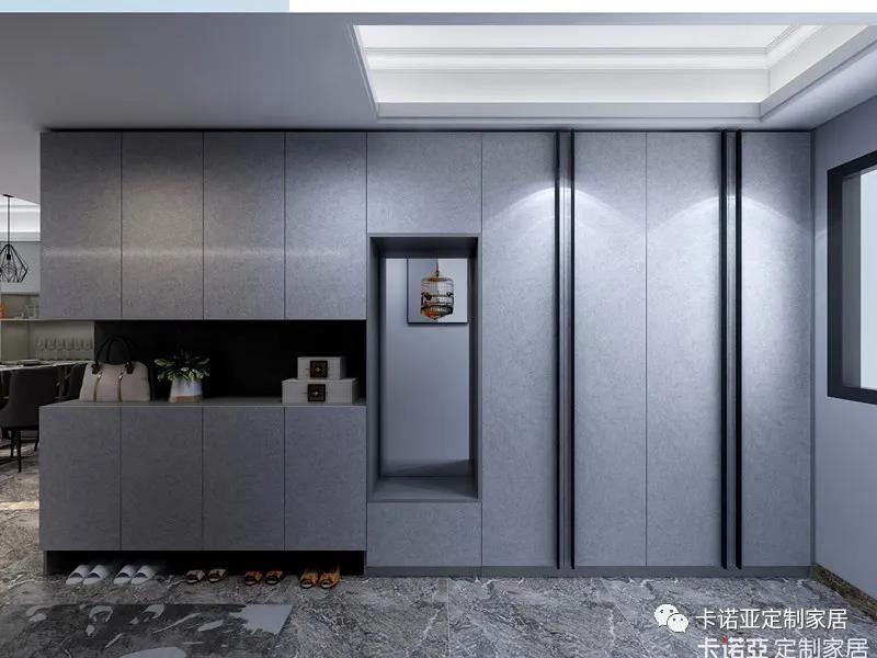 高級(jí)灰地柜+吊柜,柜體有藏有露,長條形玄關(guān)極致利用,收納性很強(qiáng)。為了方便出門整理儀容著裝,設(shè)計(jì)了一面試衣鏡,凹進(jìn)去空間設(shè)置了換鞋凳。