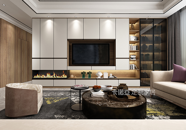 電視柜半開放設計,黑框金屬玻璃門的搭配使得整個空間更富有立體感。