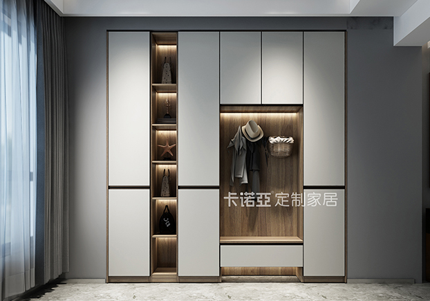 嵌入式玄關柜,下面是用木質板做成的換鞋凳,上面再設計掛鉤,這樣實用功能和裝飾作用都大大增強。