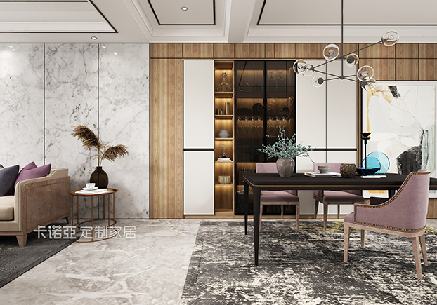 餐廳比較小清新風,淡紫色的餐凳,木色和白色相間的墻面,顏色清新的裝飾畫,都讓人很舒適輕松。