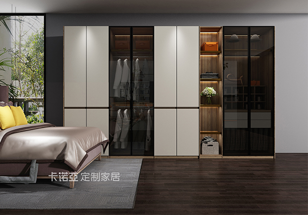臥室比較沉穩(wěn)大氣,玻璃門半開放式衣柜黑白相間,空間空曠開放,有點極簡風。