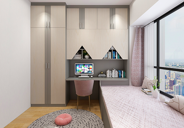 榻榻米+書(shū)桌+儲(chǔ)物柜+衣柜,平??梢宰鲎鳂I(yè)、看書(shū),多功能室完成,既是書(shū)房也是臥房,儲(chǔ)物能力MAX。