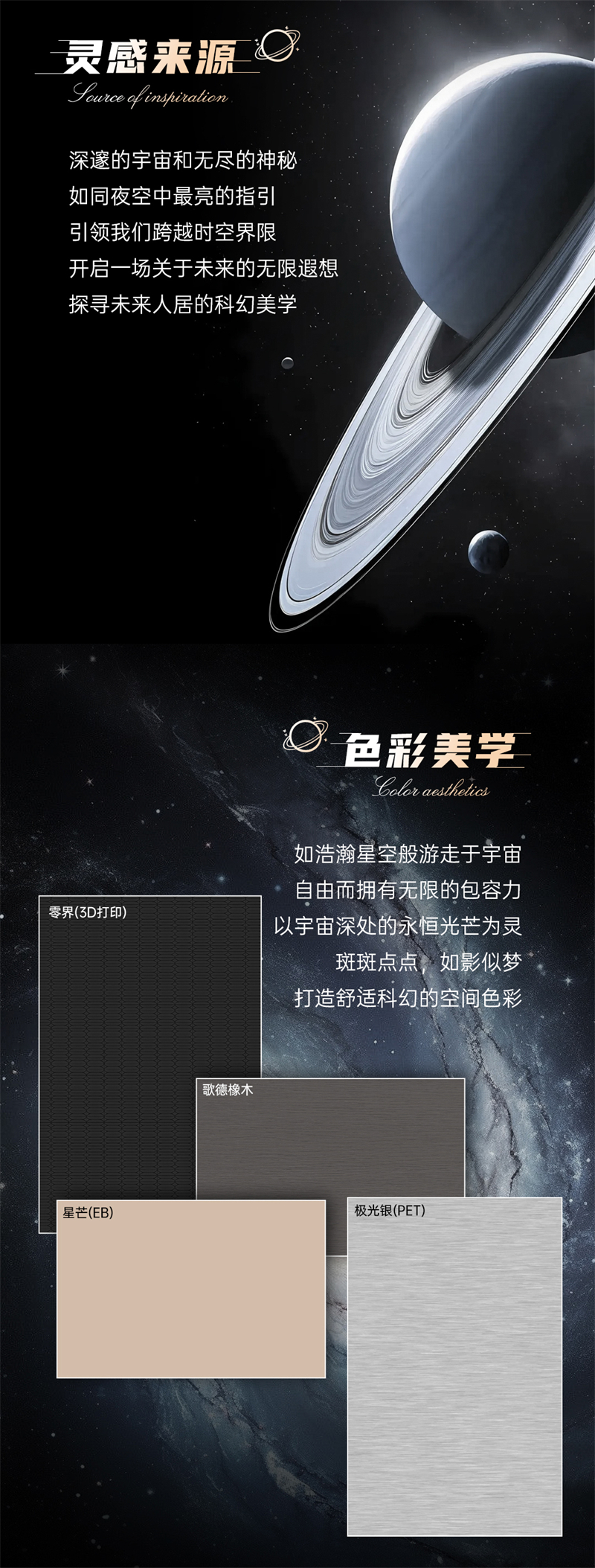 2025年新品系列,未界系列 |科技輕奢風(fēng)格以科技青年(航天設(shè)計(jì)師、汽車工程師、科技創(chuàng)業(yè)者等)職業(yè)特性為核心,融入航天元素與汽車模型展示,借助流暢線條、科技燈光,搭配智能家居,營造未來感氛圍,滿足對(duì)科幻的遐想,實(shí)現(xiàn)科技與生活的融合,展現(xiàn)探索精神。