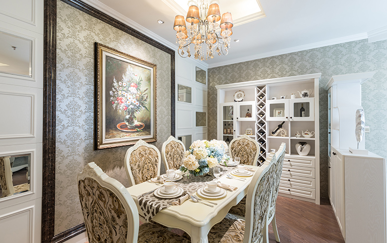 餐廳充盈著白色的純粹,如初戀般純凈與美好,橡木錯(cuò)落有致的紋理,帶來(lái)別樣精致的質(zhì)感。家具中流暢線條的寫意設(shè)計(jì),看似隨意刻畫的簡(jiǎn)歐風(fēng)情卻表達(dá)得恰到好處。