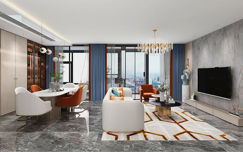 客餐廳打通,沙發(fā)隔斷,兩個空間相對獨立又相連。多人位白色沙發(fā),混搭單人位暗紅色沙發(fā),與餐桌椅在色彩上有呼應(yīng)。選擇歐式水晶吊燈,貴氣呼之欲出。一字型電視柜,臺面采用帶有木紋的“流光漫步”,減緩空間大理石與灰色系的冷感。