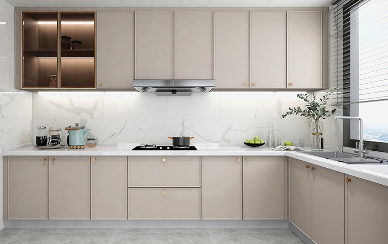長條形廚房定制L型廚柜,轉(zhuǎn)角不浪費,大量的地柜、吊柜,炊具刀具調(diào)料通通隱藏,讓臺面保持整潔。吊柜中加入玻璃材質(zhì)+燈帶,一改整堵墻封閉式柜子的壓迫感,下廚多了一份輕盈。應(yīng)用高級“優(yōu)雅暖灰”,瞬間營造高端廚房印象。
