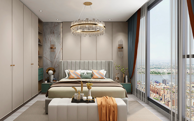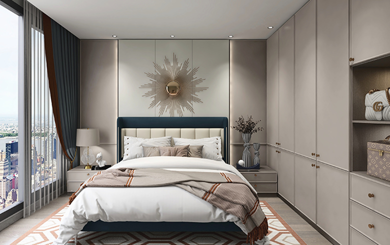臥房大量應(yīng)用淺色調(diào)“流光漫步、優(yōu)雅暖灰”,安定情緒,助力睡眠。床頭背景墻使用護墻板,隔音降噪,柔軟的絲絨床頭可以靠著看書,適合睡前閱讀。床頭柜加入跳躍的“電光墨綠”,讓臥室洋溢大自然氣息。床側(cè)定制靠墻衣柜,一側(cè)做成半開放式,更適合放置睡前常用物品。