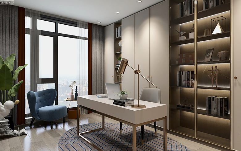 靠墻定制書柜,柜門、柜體采用“優(yōu)雅暖灰、流光漫步”的搭配,讓書房氣質(zhì)超然。開放加封閉結(jié)合,讓空間有了呼吸感,工作身心更愉悅。玻璃柜門方便打理也同時擁有展示功能,落地窗邊放置一張沙發(fā)和邊幾,營造慵懶氛圍,累了可以在此品茗休憩。