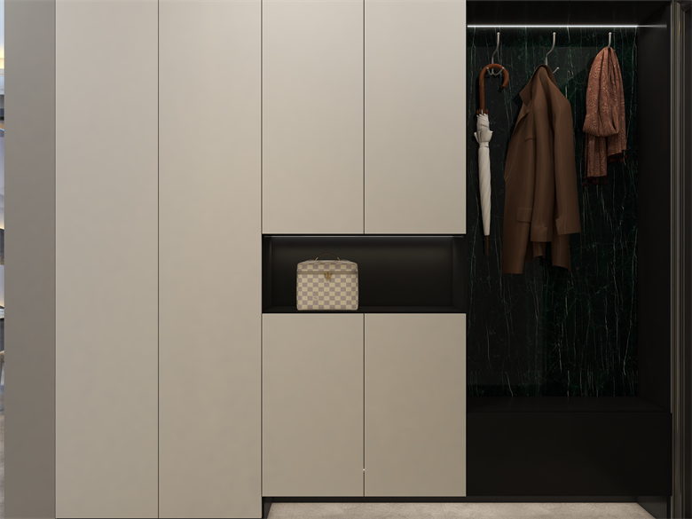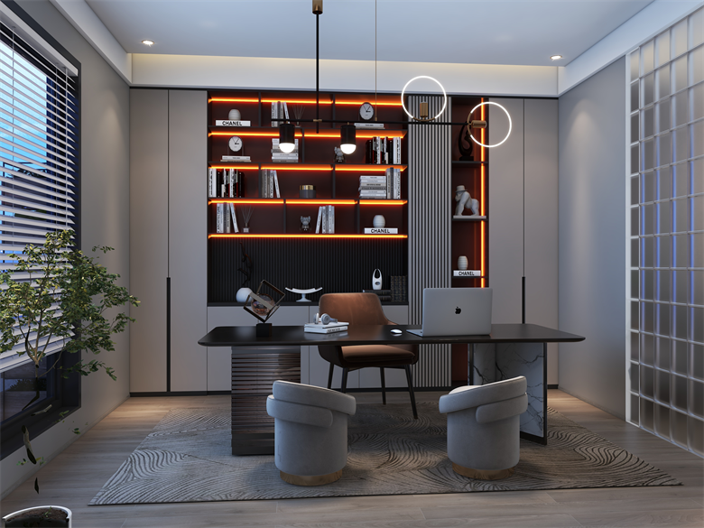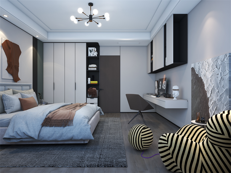 此案,為現代極簡風格,整體以簡單大氣,穩(wěn)重不失溫馨,設計上嚴格遵循人體工程學原則,在造型、材質等方面要符合人的生理和心理需求。此案設計的色彩比較單一,顏色多選用單色,或少數幾種顏色搭配。避免使用多種顏色混搭以及避免使用強烈對比的顏色,復雜華麗的顏色,反對繁瑣的花紋色彩的搭配。在色彩上追求平和、舒緩、內斂之感極簡主義的設計多采用直線、方形,或規(guī)則簡單的幾何形狀,減去一切不必要的元素與細節(jié),比例精確,整體呈現簡潔明快,干凈利落感覺。此案中大部分空間運用了無主燈,因為無主燈設計講究的是“見光不見燈,分區(qū)域散點照明”。而且的無主燈設計能夠讓空間更具層次感,顯得非常的高級,若隱若現,層次分明。