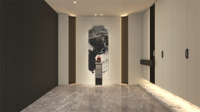 門(mén)廳:新中式元素“奢石”地臺(tái)作為點(diǎn)綴,開(kāi)啟新國(guó)潮視覺(jué)盛宴。護(hù)墻板燈帶勾勒出簡(jiǎn)約的宮燈形狀,與右邊柜門(mén)的燈籠造型拉手遙相呼應(yīng)。對(duì)稱式圓弧轉(zhuǎn)角,將護(hù)墻板與玄關(guān)柜柔美連接,渾然一體,自然天成。