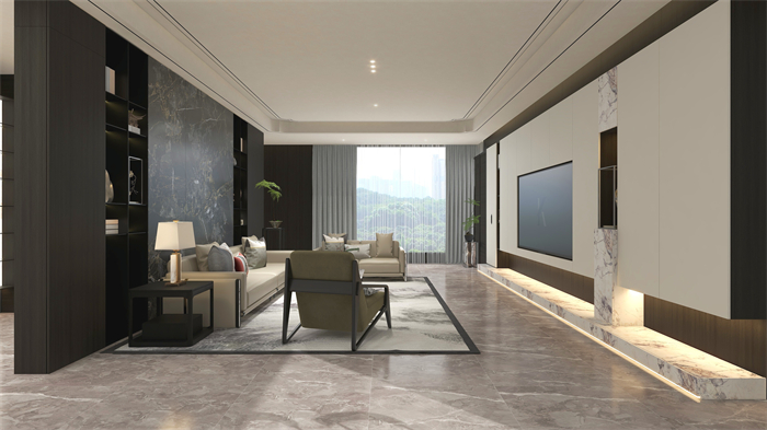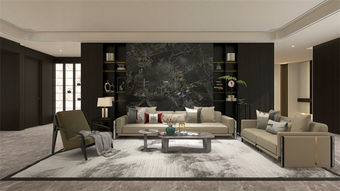 沙發(fā)背景啞黑鋁板柜對(duì)稱設(shè)計(jì),與深色“沉香”完美契合,遇見(jiàn)東方禮序之美,木紋、石紋、鋁板,傳統(tǒng)與現(xiàn)代材質(zhì)碰撞彰顯層次感,搭配國(guó)風(fēng)家品,更顯東方意境。