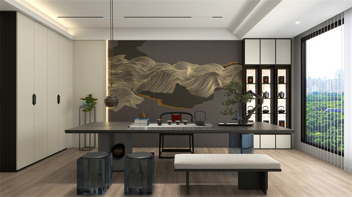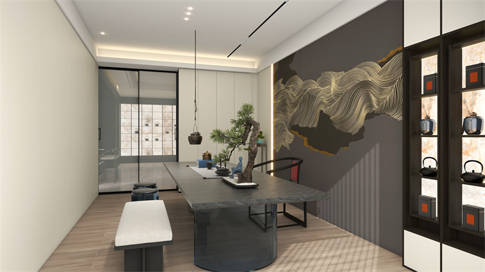 茶室:打破傳統(tǒng)對(duì)稱均衡,一側(cè)一門(mén)到頂封閉柜,一側(cè)半開(kāi)放式設(shè)計(jì),既彰顯東方韻味,又為視覺(jué)做減法,簡(jiǎn)單大雅。玻璃的通透與木紋的肌理相互交融,剛?cè)嵯酀?jì),精致而高級(jí)。