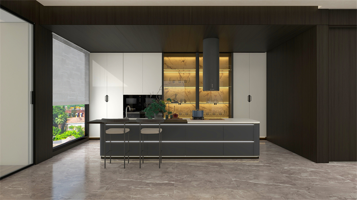 廚房:廚房結(jié)合現(xiàn)代生活需求,以小吧臺(tái)+開(kāi)放西廚的形式呈現(xiàn),一字形島臺(tái)延伸出洗切煮及餐桌多重功能,散發(fā)著清透高級(jí)的雅致;櫥柜+餐酒柜合二為一,琳瑯滿目的酒水、餐具陳列于金屬玻璃柜中,給人以唾手可得的滿足感。