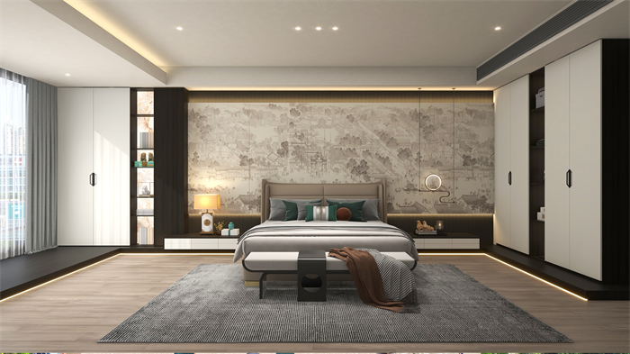 主臥:衣柜及床頭柜采用對(duì)稱式設(shè)計(jì),與圓形燈裝飾掛件形成了方與圓的空間禮序,多處鏤空設(shè)計(jì)展示朦朧透視的詩(shī)意想象。床尾凳實(shí)用與顏值兼?zhèn)洌┑囊路梢苑旁谶@里,還可充當(dāng)早餐椅,就著陽(yáng)光,吃著早餐。深色U型地臺(tái)將淺色柜體抬起,收納與顏值兼?zhèn)洌?D錯(cuò)落增加懸浮感,搭配古風(fēng)市井畫(huà),夢(mèng)回千年古都。