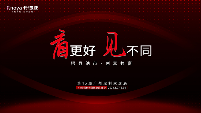 2024年3月27日-30日,第13屆中國廣州定制家居展覽會(huì),將在廣州保利世貿(mào)博覽館舉行。存量房時(shí)代,下游家居業(yè)處于變革發(fā)展周期,市場分級(jí)、用戶分層,越來越多企業(yè)通過創(chuàng)新尋求業(yè)績新增長點(diǎn),定制家居業(yè)迎來新一輪高質(zhì)量發(fā)展變革浪潮。專注定制家居23年的卡諾亞,將攜1121戰(zhàn)略、2大新品強(qiáng)勢亮相本屆展會(huì),助力加盟商打造差異化競爭優(yōu)勢。屆時(shí)誠邀各界精英蒞臨3B04展館,看更好的卡諾亞,見不同的大未來,廠商攜手“招縣納市·創(chuàng)富共贏”。