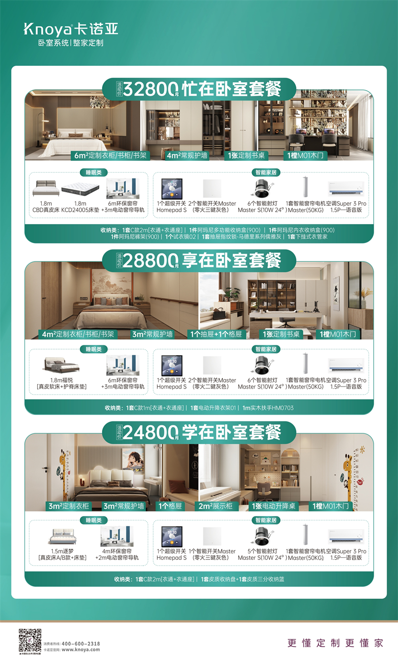 卡諾亞此次315活動(dòng),攜手多個(gè)高端品牌如芝華仕、CBD、云米科技等,為消費(fèi)者提供一站式的家居解決方案。活動(dòng)期間,卡諾亞除了以上2大套餐,還精心推出32800元忙在臥室套餐、28800元享在臥室套餐、24800元學(xué)在臥室套餐等,涵蓋臥室系統(tǒng)+整家定制兩大品類,包括定制柜、護(hù)墻板、全屋家具以及智能家電,聯(lián)手更多大牌,真正實(shí)現(xiàn)“整家定制更高配,全屋家具更滿配,智能家電更全配”的理念。
