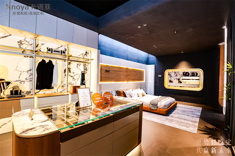 其次,設(shè)計(jì)上,依靠原創(chuàng)設(shè)計(jì)構(gòu)筑美學(xué)家居。卡諾亞推出的輕高定系列新品,均屬于原創(chuàng)設(shè)計(jì),以本次參加輕高定展的現(xiàn)代中式藏玉系列為例,采用天然胡桃木皮與數(shù)碼打印石紋碰撞,原創(chuàng)品牌 LOGO 拉手與倒 R 角工藝相映成趣等,為企業(yè)高管精英構(gòu)建禮序雅境;另一參展作品雅致輕奢風(fēng)格格雅系列,從高級珠寶中淬煉靈感,運(yùn)用珍珠貝母漆的流光、拉絲黃銅的肌理等元素,結(jié)合豪華游艇的舷窗式結(jié)構(gòu)打破傳統(tǒng)空間的方正,發(fā)光層板與榆木木皮形成冷暖對話等,將藝術(shù)基因注入實(shí)用主義,打造功能多元化的美學(xué)家居空間。