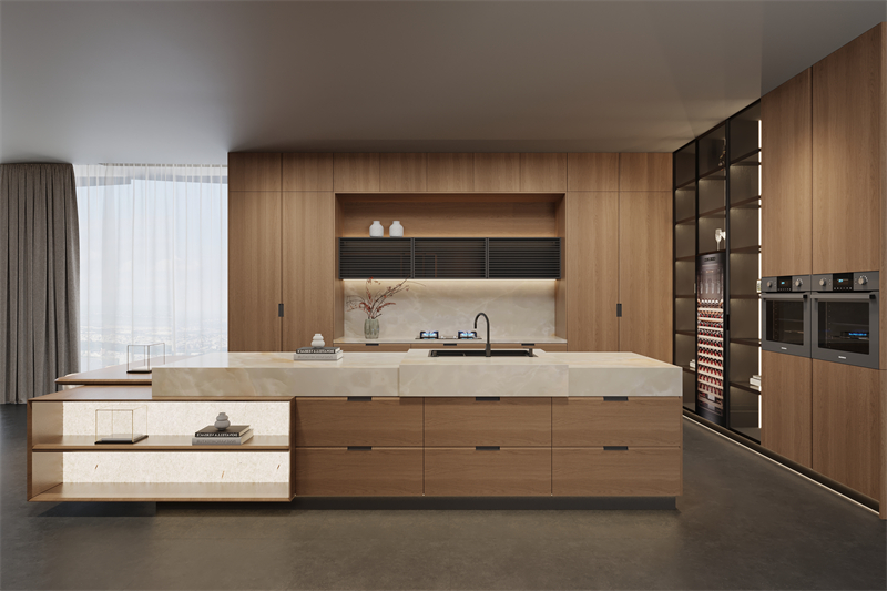 產(chǎn)品亮點(diǎn):1.形:K冕拉手門型將冠冕與K字原創(chuàng)設(shè)計(jì)相結(jié)合,巧妙傳遞品牌的尊榮之意。2.質(zhì):甄選天然木皮,其天然紋理與自然色彩,賦予空間沉穩(wěn)深邃之感。3.氣:鑲嵌、圓弧、3D數(shù)碼打印等傳統(tǒng)工藝與現(xiàn)代技術(shù)結(jié)合,現(xiàn)代中式美家呼之欲出。4.韻:冰裂紋發(fā)光板的運(yùn)用,宛如冰凌閃耀,映照星光,為空間增添夢(mèng)幻般的詩(shī)意氛圍。5.神:中島臺(tái)升降置物架、高端智能衣物護(hù)理機(jī)等智能配置,為生活帶來(lái)便捷與品質(zhì)。