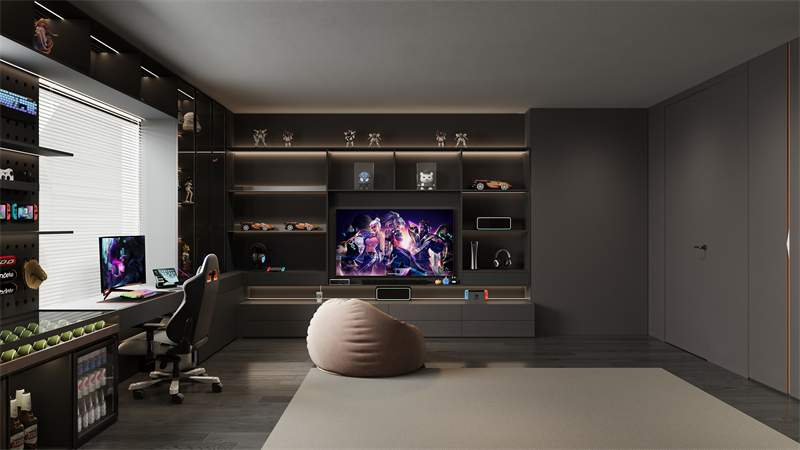 對于熱愛娛樂的活力青年,“樂在臥室” 設計融入了豐富的娛樂元素。配備了超大屏幕的電視或投影儀,打造私人家庭影院。競技區(qū)則配備可升降的電競桌椅,自適應腰托和4D 扶手可以根據(jù)身體姿勢自動調(diào)節(jié),緩解疲勞。此外,裝備補給站就在手邊,方便拿取手柄耳機等裝備,讓你在游戲中隨時保持最佳狀態(tài),讓臥室成為娛樂與休閑的雙重空間。