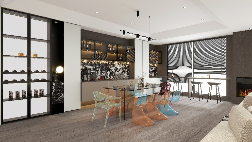 餐廳區(qū)域巧妙融入了品酒區(qū)和咖啡區(qū)。PET材質(zhì)的餐邊柜臺面觸感細(xì)膩,耐高溫且易于清潔,完美適配年輕人的生活方式。墨海云巖三胺點(diǎn)綴色與生椰灰主色調(diào)形成優(yōu)雅對比,營造出精致的用餐氛圍。從早餐的明亮活力到晚餐的溫馨浪漫,全方位滿足年輕人的生活儀式感。