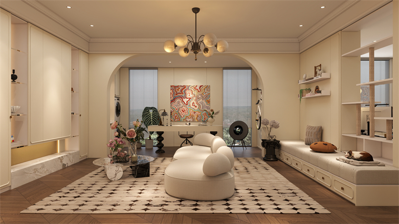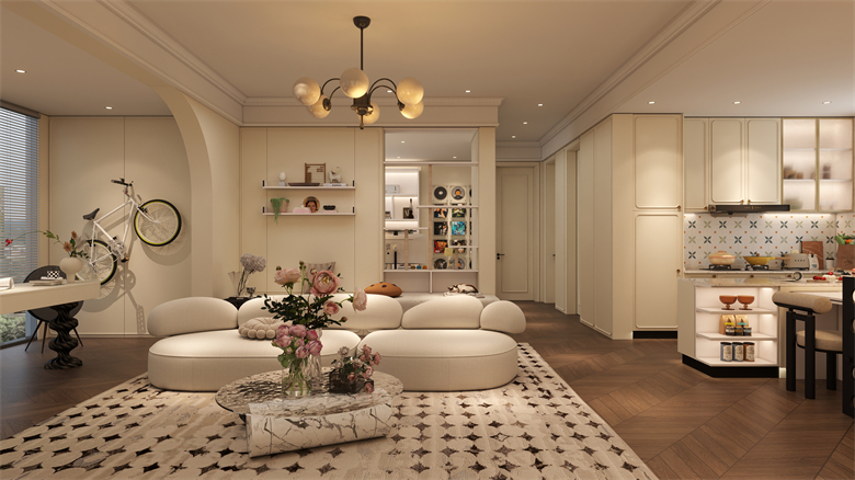 香草奶油主調(diào)營造出溫柔的空間基調(diào),電視柜與餐邊柜采用香頌門型設(shè)計,通過吸塑工藝呈現(xiàn)優(yōu)雅流暢的曲線,為空間增添一抹靈動的韻律感。開放式布局巧妙串聯(lián)起家庭生活場景,在通透的空間中詮釋著法式家居的精致美學。