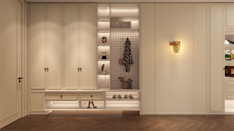 推開門的瞬間,羅亞用香頌白的柜體營造出如巴黎公寓般的迎賓氛圍。法式的線條營造溫馨浪漫情調(diào),以獨特和優(yōu)雅的方式融合古典與現(xiàn)代風格。法式線條勾勒的玄關(guān)柜不僅滿足收納需求,更讓歸家成為一場視覺享受。