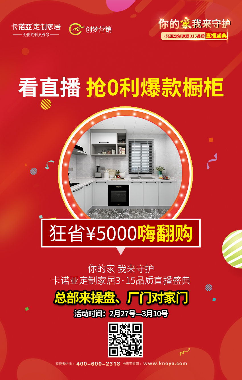 PS: 最新上線的「卡諾亞3.15品質(zhì)直播盛典—在線搶工廠,直播搶福利」,足不出戶定制夢想廚房,爆款廚柜直降¥5000,更有機會搶巨額百萬紅包雨,抽取家紡、床墊、電子秤等各類大獎喔~