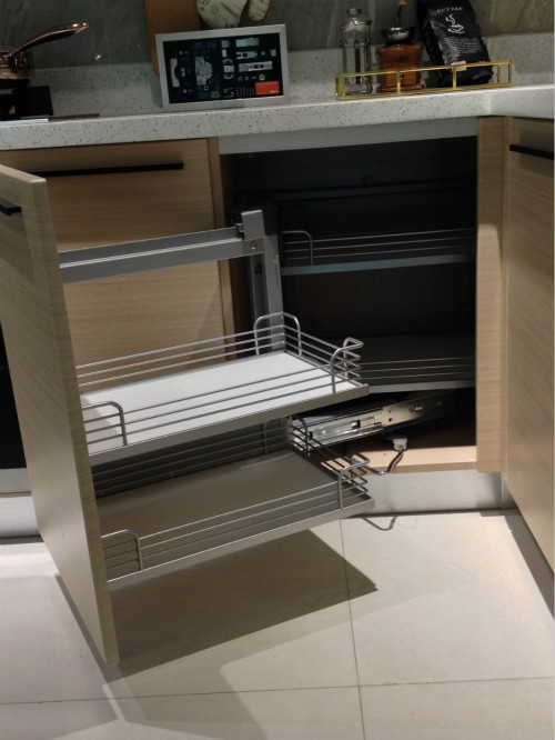 裝修過的業(yè)主表示,選部分柜子改成拉籃非常有必要,尤其有助于增加廚房收納。比如灶臺下改成碗碟拉籃,吊柜中加裝下拉拉籃,櫥柜轉(zhuǎn)角處裝怪物拉籃等,都是非常劃算的一筆投入。