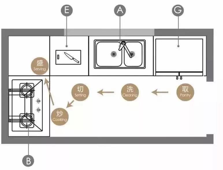 想要下廚不累,廚房動線和布局一定要合理。最常見的櫥柜布局有一字型、二字型、L型、U型和中島型5種,要根據(jù)廚房面積大小和管道位置選擇,不管選哪種,都要保證洗、切、炒的動線最短。