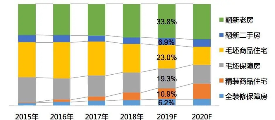 事實上,趨勢早已顯現(xiàn)。權(quán)威調(diào)研數(shù)據(jù)顯示,從住宅裝修市場的產(chǎn)值結(jié)構(gòu)來看,老房及二手房翻新市場在2019年合計占比超過40%,2020年將超過42%。而毛坯商品住宅市場的比重持續(xù)下降,2019年預計略低于23%,2020年可降至17.6%,毛坯房市場在2020年也將低于37%。由此,存量房翻新超過毛坯房市場產(chǎn)值規(guī)模的時代將繼續(xù)深化。