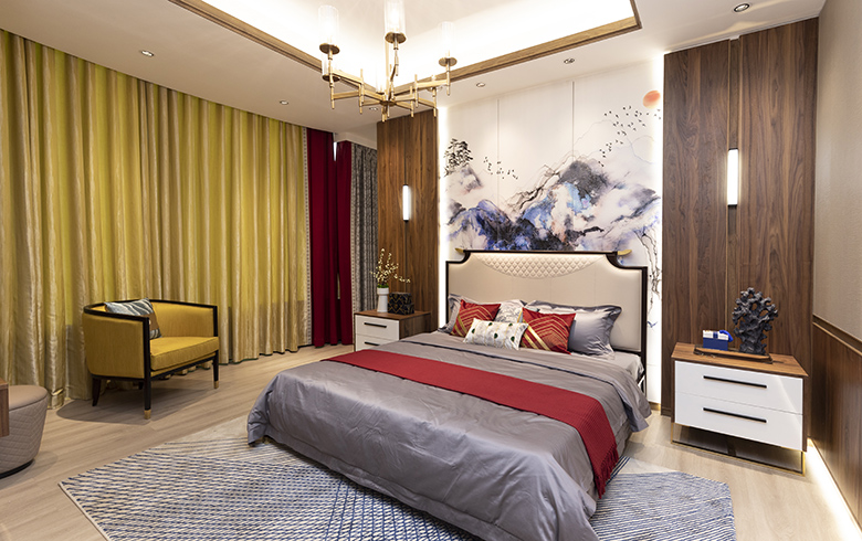卡諾亞丨東方雅閣·臥房采用隔斷柜隔開主臥和衣帽間功能區(qū),相對獨立、互不干擾,一邊是全身試衣鏡,一邊是梳妝臺,中式屏風點綴,讓隔斷柜成為臥房一道靚麗的風景線。歐式墻裙、中式臥榻、床頭3D中式山水裝飾畫、皇家黃與中國紅搭配的窗簾、對稱均衡的設計,讓臥房別具東方人文氣質。