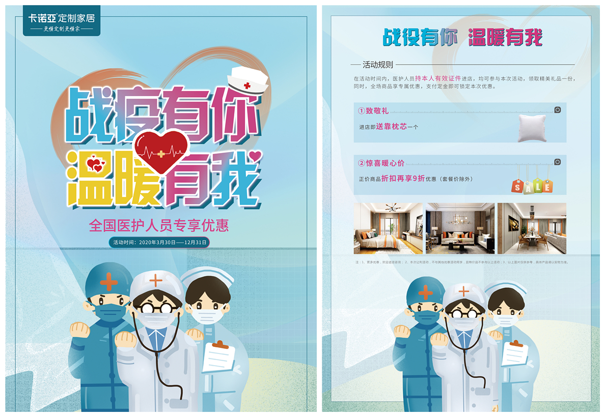 戰(zhàn)疫在前線的醫(yī)務(wù)人員,他們用大愛(ài)護(hù)大家,而卡諾亞作為定制家居行業(yè)的領(lǐng)軍者之一,疫情當(dāng)前身體力行地承擔(dān)起企業(yè)的社會(huì)責(zé)任,積極傳遞正能量,發(fā)揮自身的光和熱,為愛(ài)放價(jià),以自己的綿薄之力回饋他們,呵護(hù)他們的愛(ài)家,做逆行者堅(jiān)強(qiáng)的后盾。