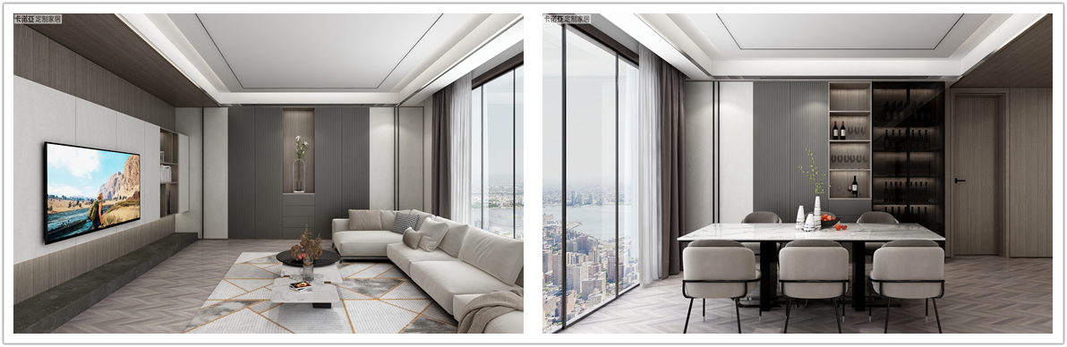 卡諾亞“銀絲木”大面積運(yùn)用,“慕尼黑”格柵門板作為點(diǎn)綴,搭配米色的沙發(fā)和白色大理石餐桌,整個(gè)空間硬朗有張力,凸顯現(xiàn)代都市生活注重快節(jié)奏與簡(jiǎn)潔實(shí)用。