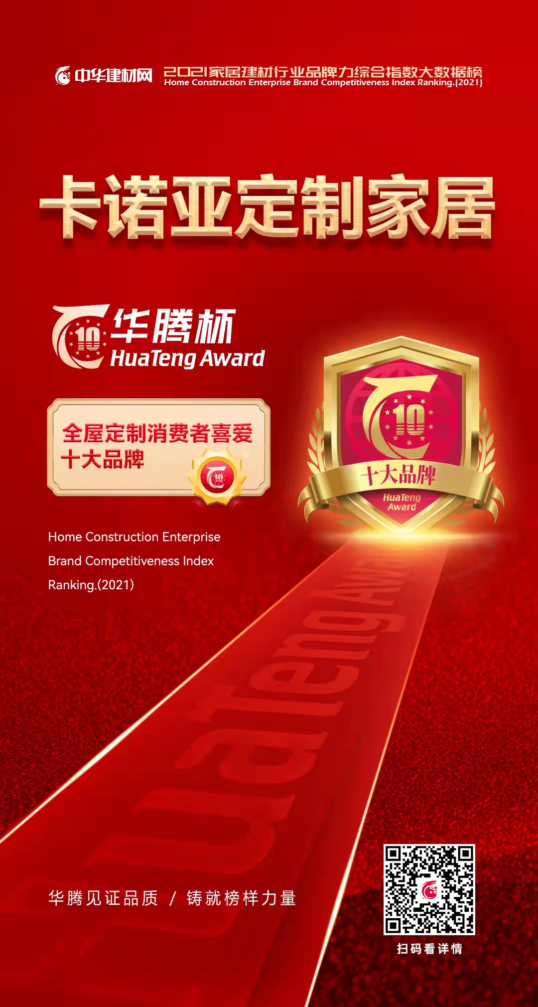 9月1日,由中華建材網(wǎng)主辦的“華騰杯·2021家居建材行業(yè)品牌力綜合指數(shù)大數(shù)據(jù)榜”重磅揭曉,卡諾亞定制家居憑借品牌綜合實(shí)力,榮獲“全屋定制消費(fèi)者喜愛(ài)十大品牌”,彰顯公司在產(chǎn)品、設(shè)計(jì)及服務(wù)層面滿足新消費(fèi)升級(jí)需求,助力中國(guó)消費(fèi)者對(duì)高品質(zhì)家居和幸福生活的追求。