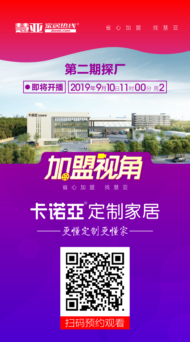 重磅信息!??!9月10日慧亞家居熱線《加盟視角》將會正式開播,走進家居行業(yè)知名品牌卡諾亞,專業(yè)定制家居18年,全國1000+專賣店,20余萬㎡工業(yè)4.0智造基地,每年服務百萬家庭。本期節(jié)目將全方位揭曉卡諾亞是如何讓加盟商放心賺錢!